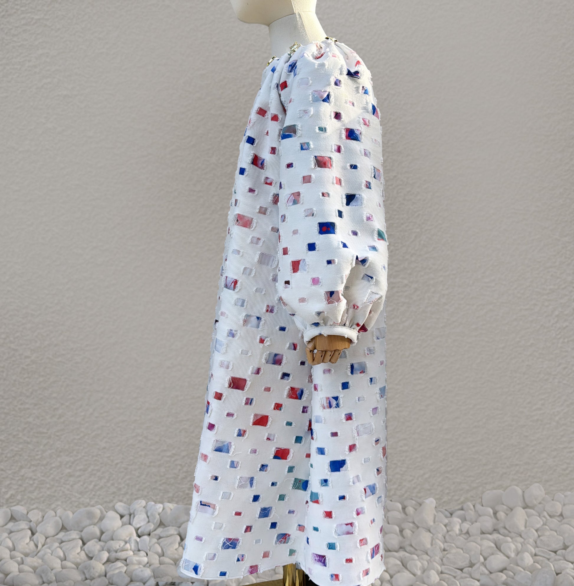 Girls’ jacquard denim kaftan featuring gathered detailing at the neckline and voluminous balloon sleeves. Finished with delicate star-shaped buttons framing the neckline, this elegant piece is perfect for Ramadan celebrations and special occasions, offering a graceful yet playful silhouette.