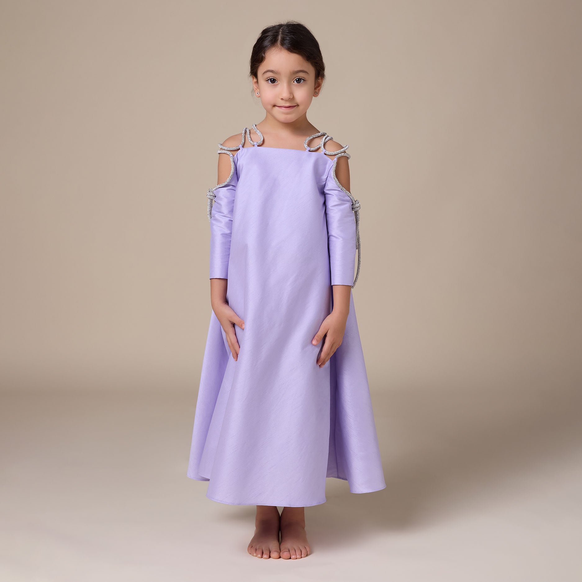 Off-shoulder purple kaftan with an alluring touch sparkly rope
