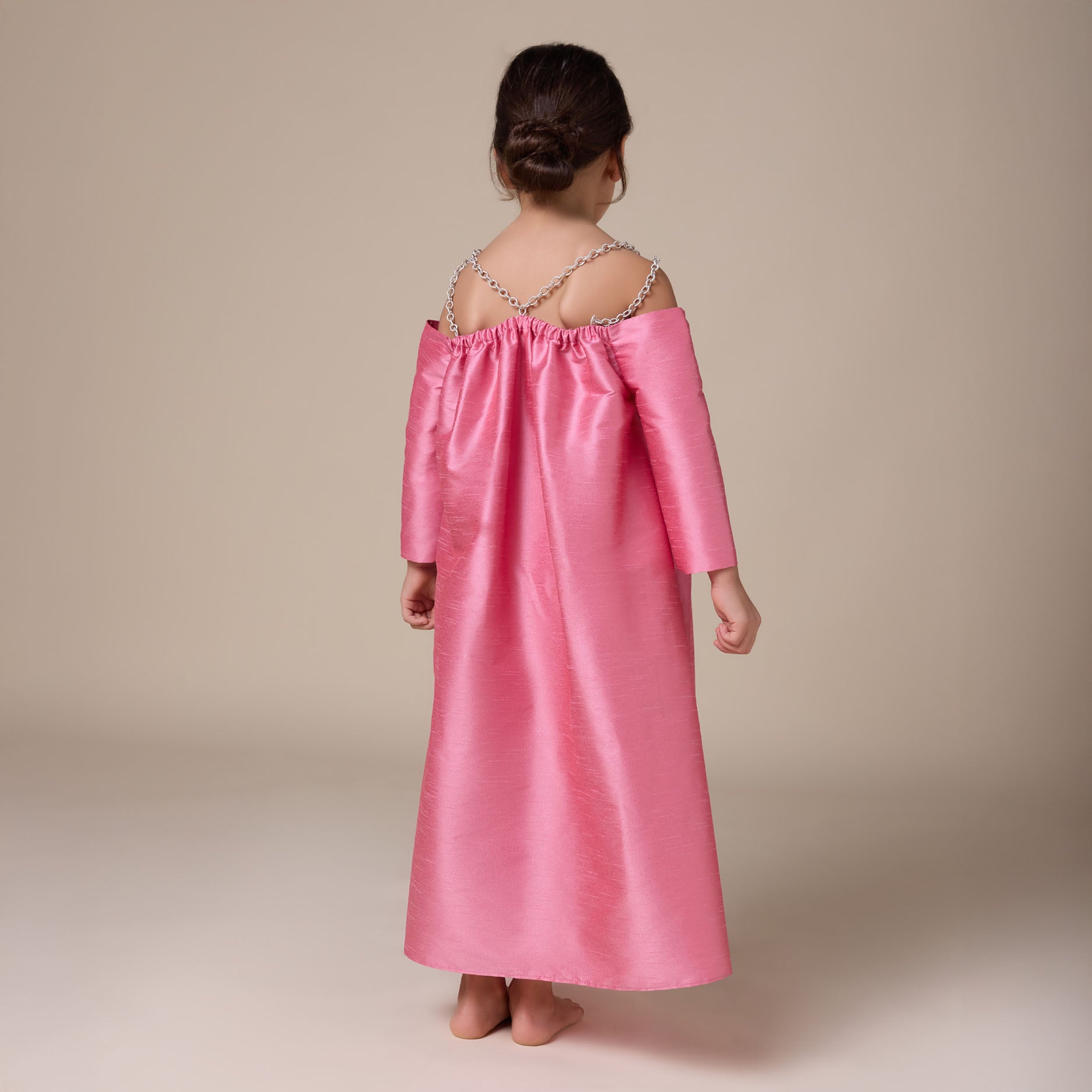 Off-shoulder pink kaftan with a chain detail on the shoulders